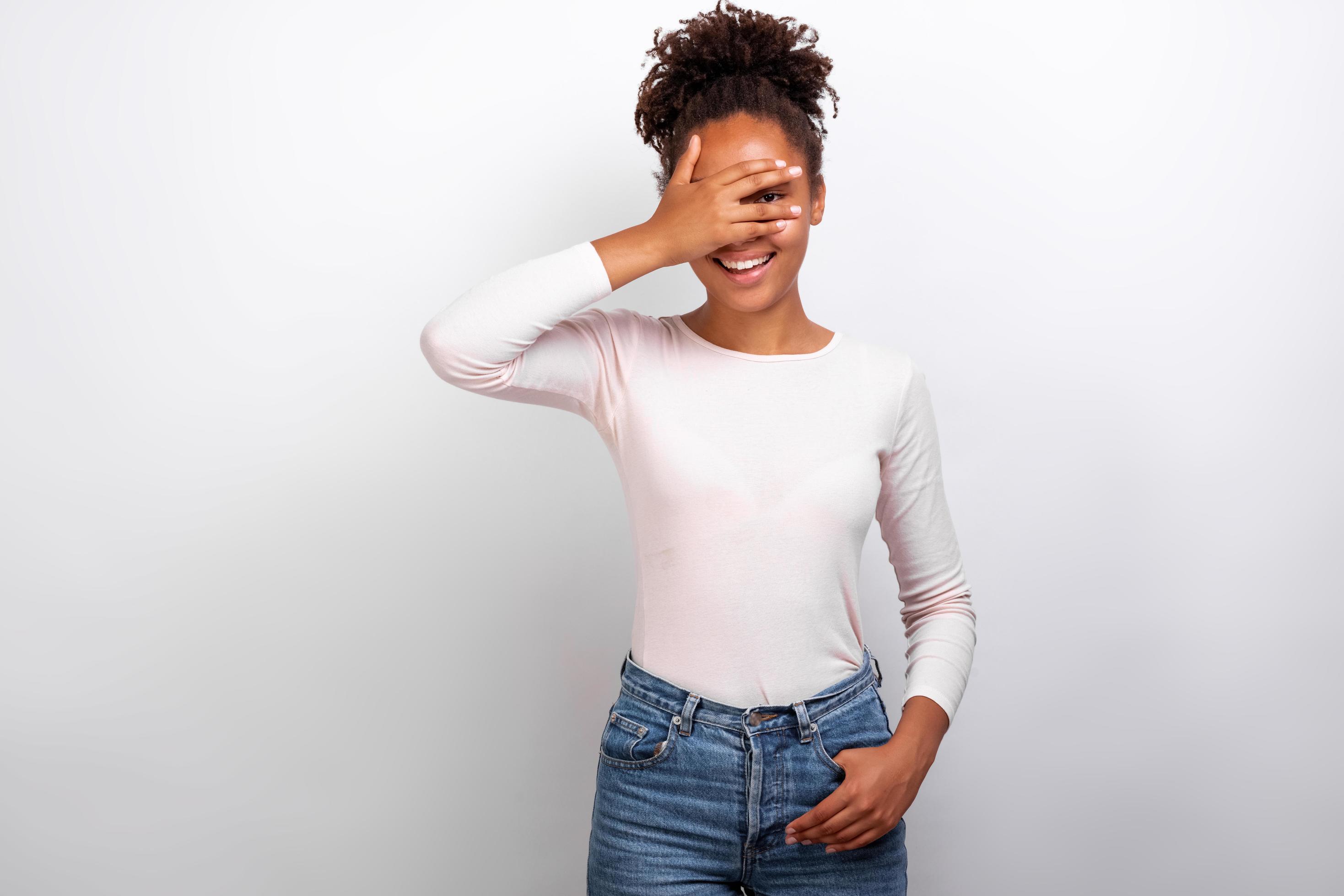 Woman Closed Eyes With Her Arm And Playfully Looking Through Fingers Standing In The Studio Image 3492158 Stock Photo At Vecteezy